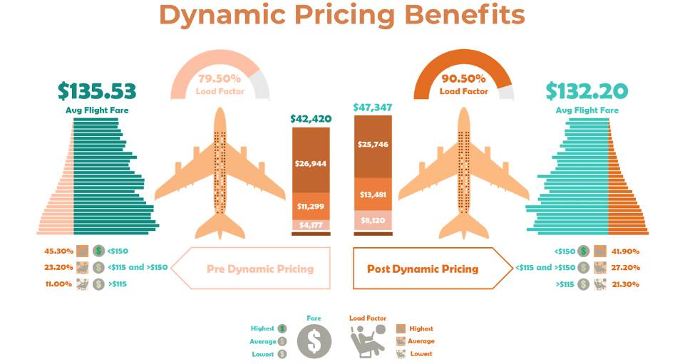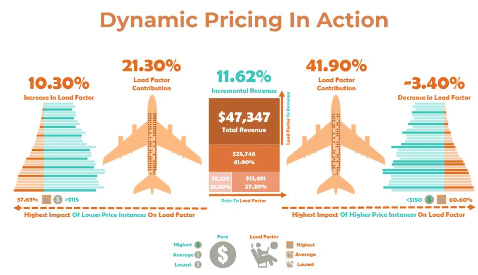 Nel determinare quanti posti proteggere per i passeggeri in economy a tariffa piena, le compagnie aeree devono tenere conto non solo della capacità e del carico statici, ma anche di una domanda dinamica, o in costante cambiamento. Questa domanda varia tra e all’interno di ogni volo a seconda della data, dell’ora, dell’origine e della destinazione. Ad esempio, i voli più popolari per i pendolari hanno spesso una domanda elevata alcuni giorni prima del volo e quindi un maggior numero di posti protetti, mentre i voli per il tempo libero hanno più probabilità di avere una domanda più bassa man mano che la data del volo si avvicina. Questo caso di domanda più elevata si riflette nelle destinazioni di vacanza più popolari e nei voli del fine settimana rispetto a quelli infrasettimanali. La Figura 1 mostra come il dynamic pricing (a destra) sia in grado di aumentare i profitti delle compagnie aeree e di diminuire le tariffe per i consumatori, aumentando il load factor. La Figura 2 illustra la relazione inversa tra il fattore di carico e la tariffa e mostra come, regolando le tariffe in base al fattore di carico in tempo reale, le compagnie aeree possano aumentare i loro profitti.